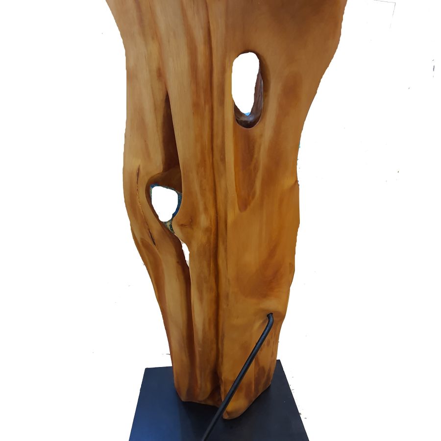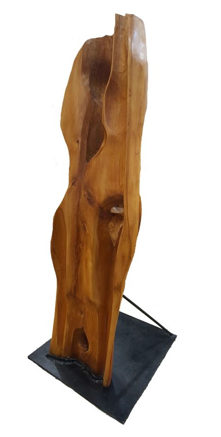 Woman Long Time Dreaming was created from a piece of timber salvaged from the lower reaches of the Huon River around 35 years ago. She travelled with me through several relationships, countless jobs and three states. Each time I had a personal crisis I managed to find time to devote to studying and shaping her. Her form evolved through the nature of the flaws in the timber, the turns of the grain and my mental image of how the female form could be expressed in timber without being overtly human. She is both complete and unfinished. A perfect female should never be finished neither shall she.”