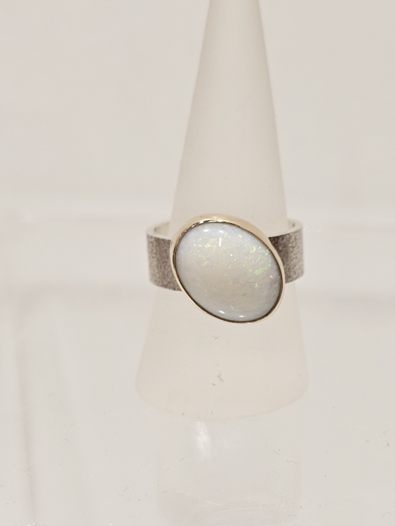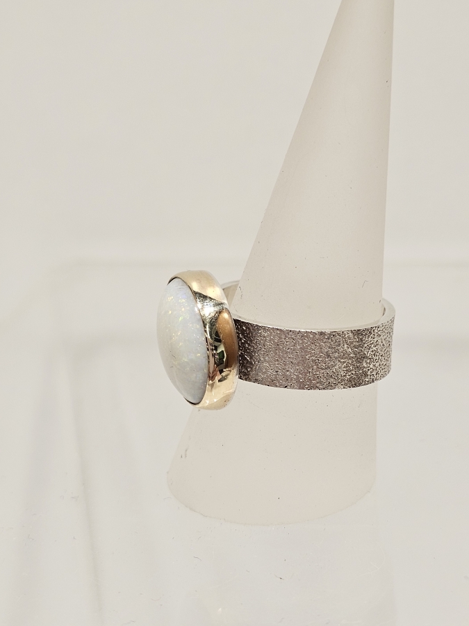 Australian Mintabie opal with a 9ct gold bezel and a sterling silver wide textured band.