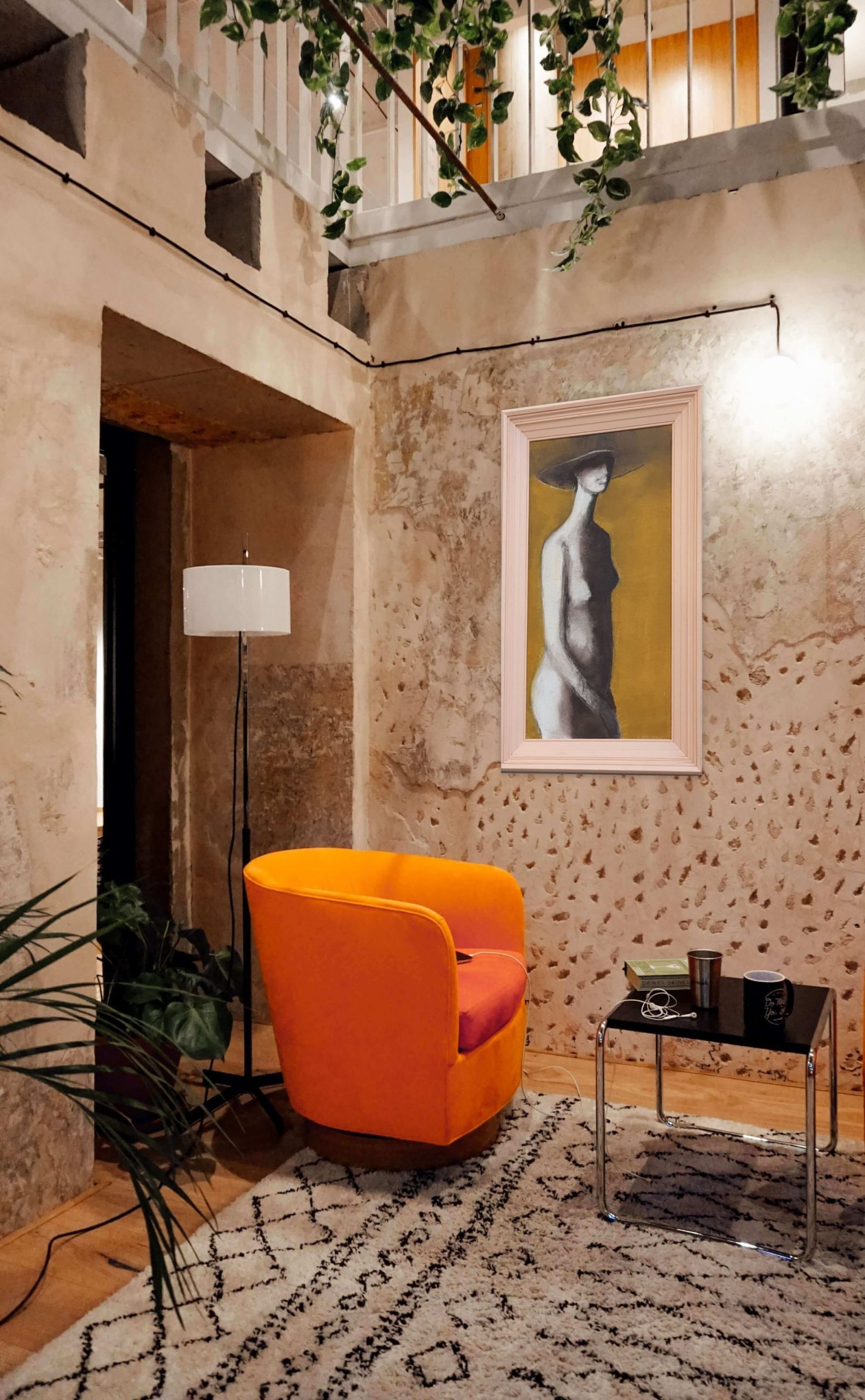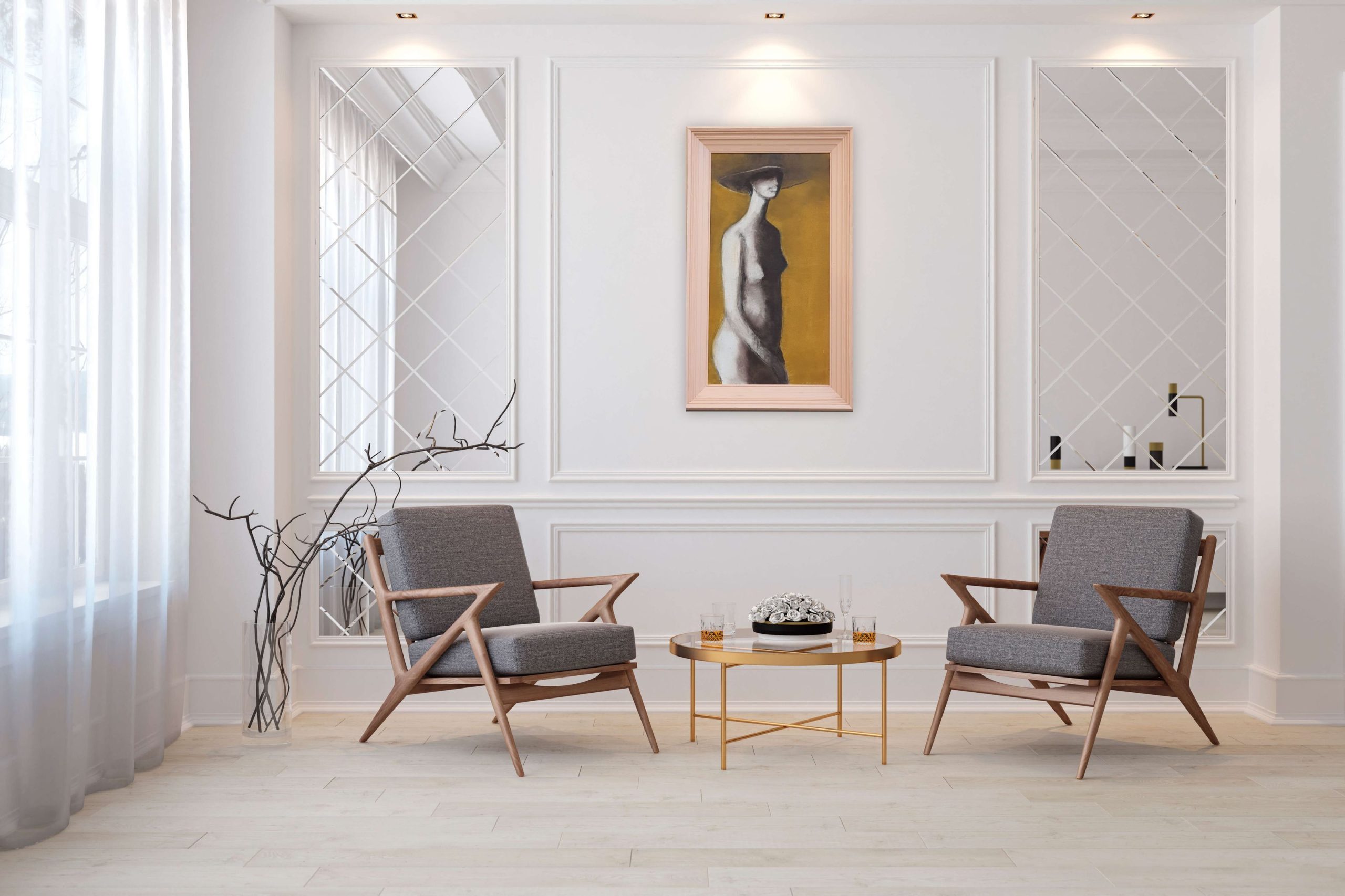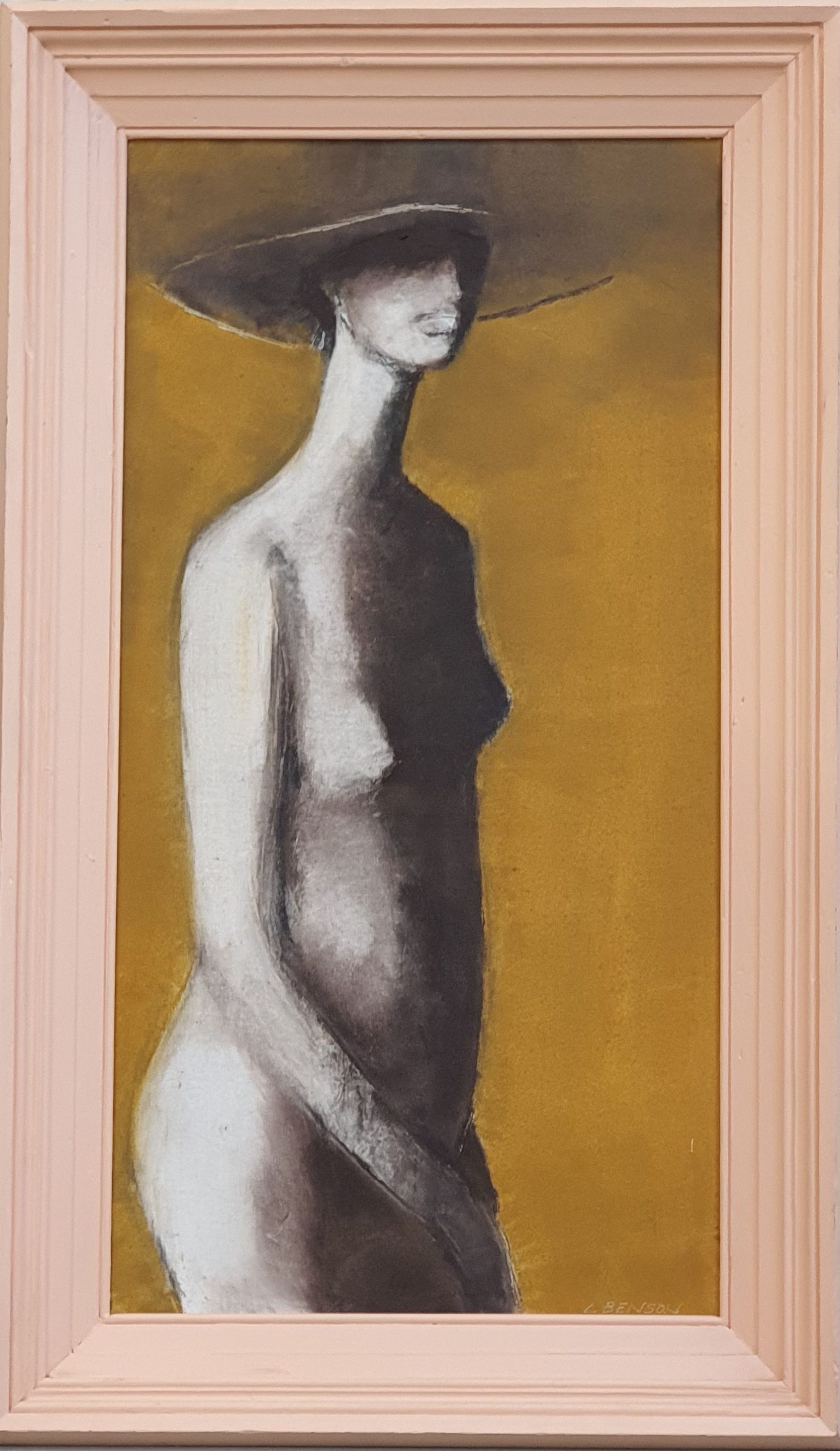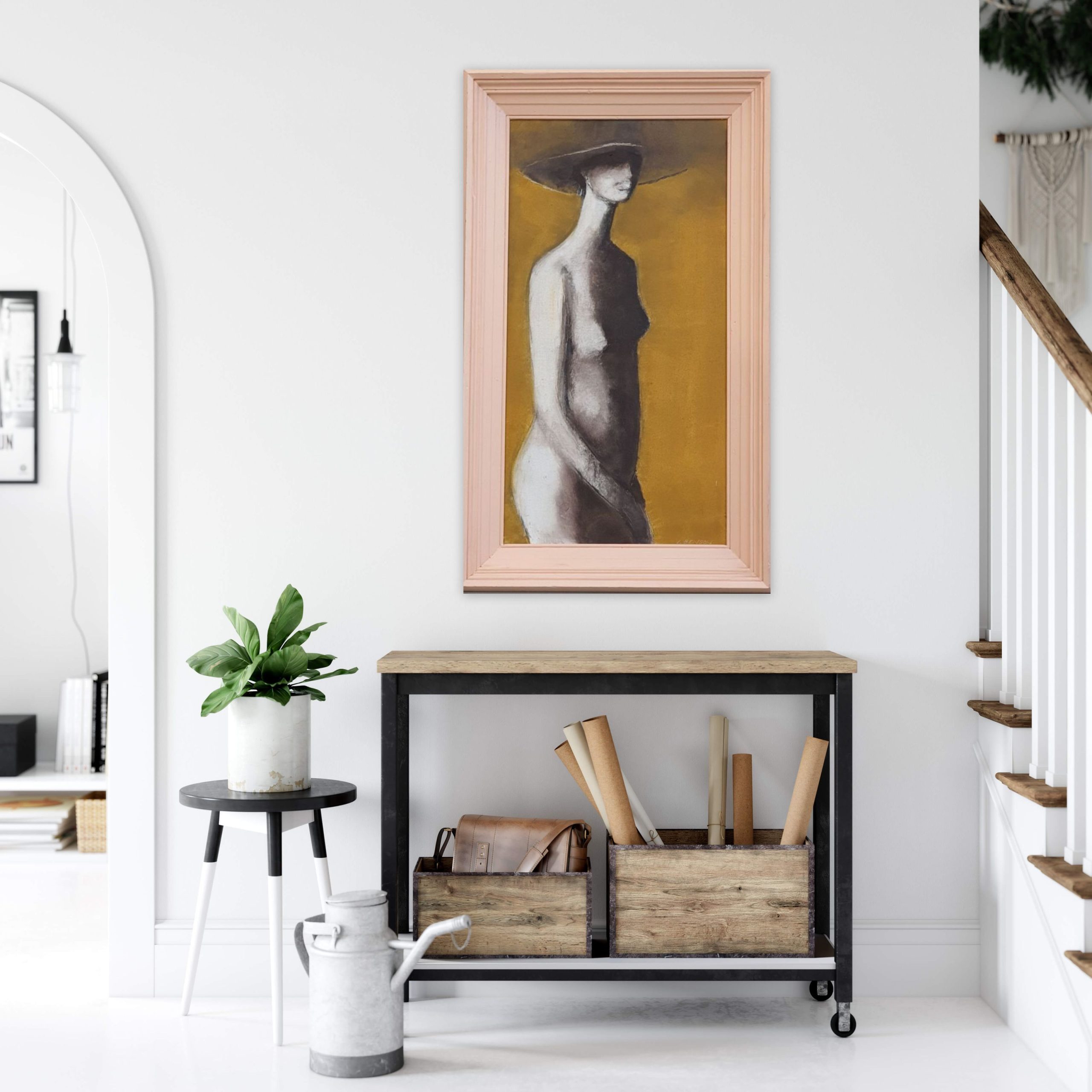 A softly rendered figure in a sea of yellow ochre. The artist made frame is wide, sculptural and painted pale pink, a perfect counterpoint to the painting.