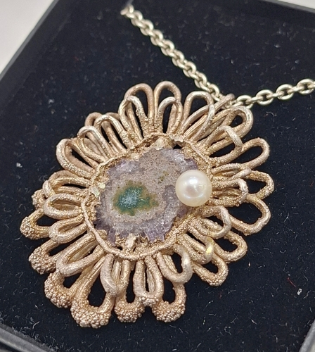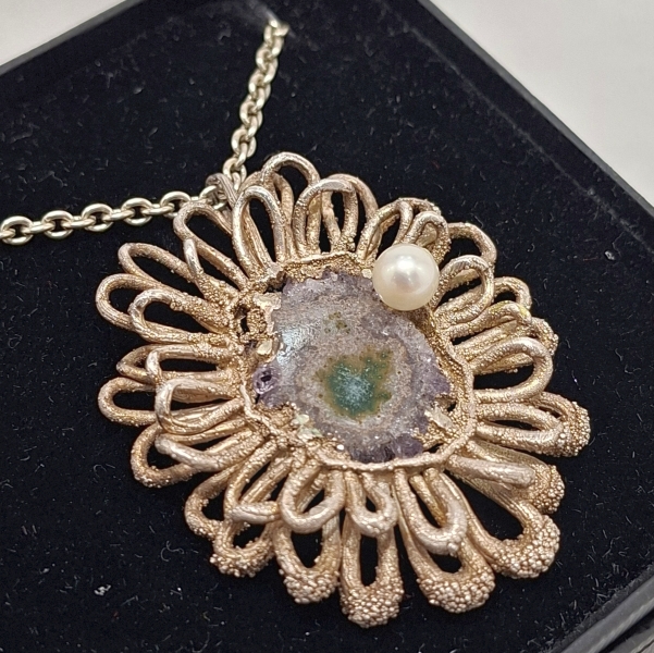 SIOMA WAJCHMAN Sterling Silver Pendant oval in shape with central amethyst crystal set and single pearl, framed by a double looped surround of silver in textured finish.