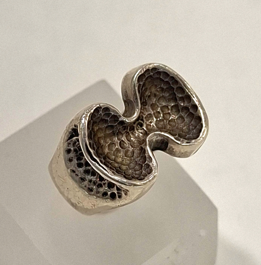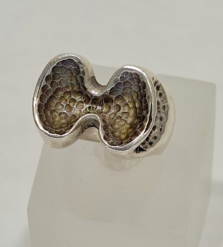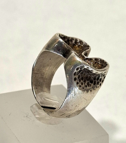 Sterling silver ring of stippled figure eight form with open ended band.