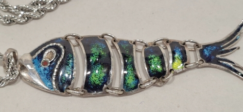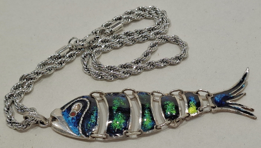 A silver articulated fish pendant with striking enamelled work, fitted with bail.