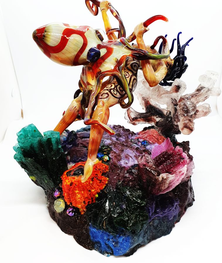 Flame worked glass (the octopus and the fishermans wife) combined with textured glass using exquisite technique and creativity from 2 master glass artisans.