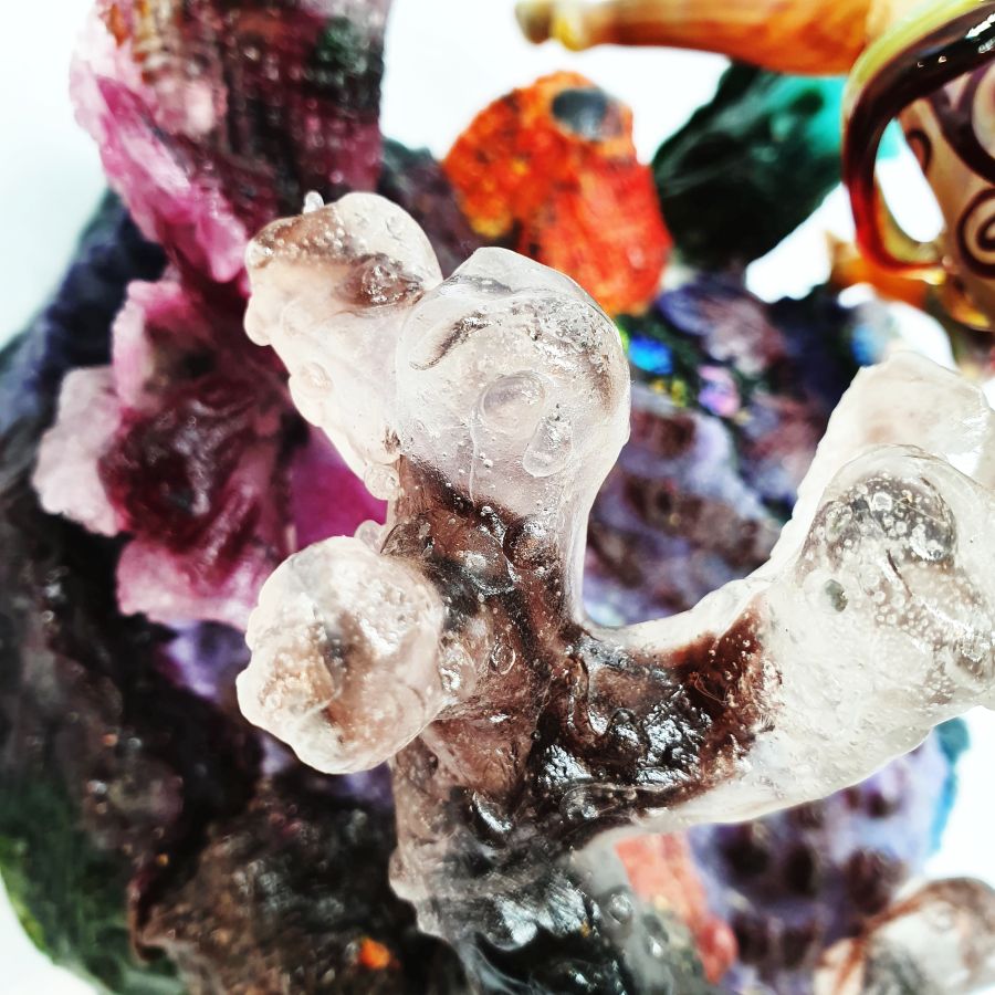 The legend of the fisherman’s wife rose from the censorship of erotic prints in Edo Japan. Artist, being artists, found a creative way around this and the fisherman’s wife being pleasured by an octopus became a common theme in Art. In this wonderful work the woman floats in ecstasy above the sea floor, her hair teased out by the sea currents. The very attractive octopus and the woman are flameworked by Christian Arnold while the richly coloured cast ocean floor is in cast glass by Laurie Young. Truly a masterpiece of collaboration in the most difficult of artistic mediums.